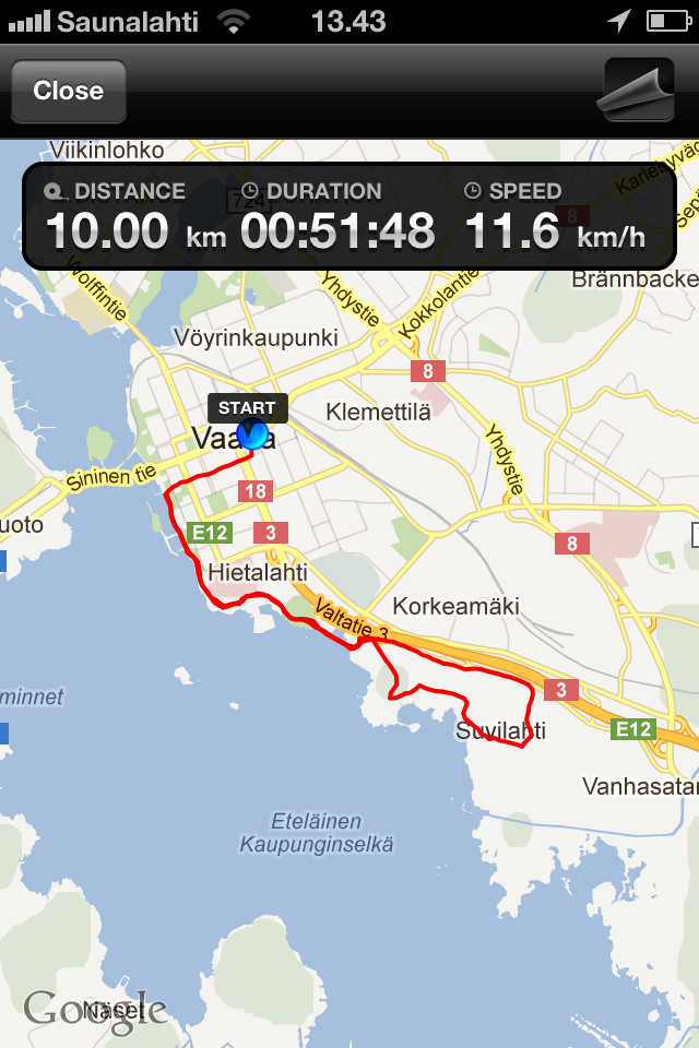 Tänään kokeilin siis juosta 10kilsaa ihan mittaamalla matkaa ja juoksunopeutta. Mulla ei ollut hirveesti käryä minkälainen vauhti riittää mihinkin ”tulokseen”. Lähdin aika kevyellä vauhdilla ja seurailin aina välillä SportsTrackerin antamaa kilometrivauhtia. Yhäkkiä huomasin että olin juossut jo 8km. Häh? menikö se näin nopeesti? Nostin vielä hieman tempoa loppua kohden. Kun 10km oli täynnä oli aikaa mennyt 51min 48s.