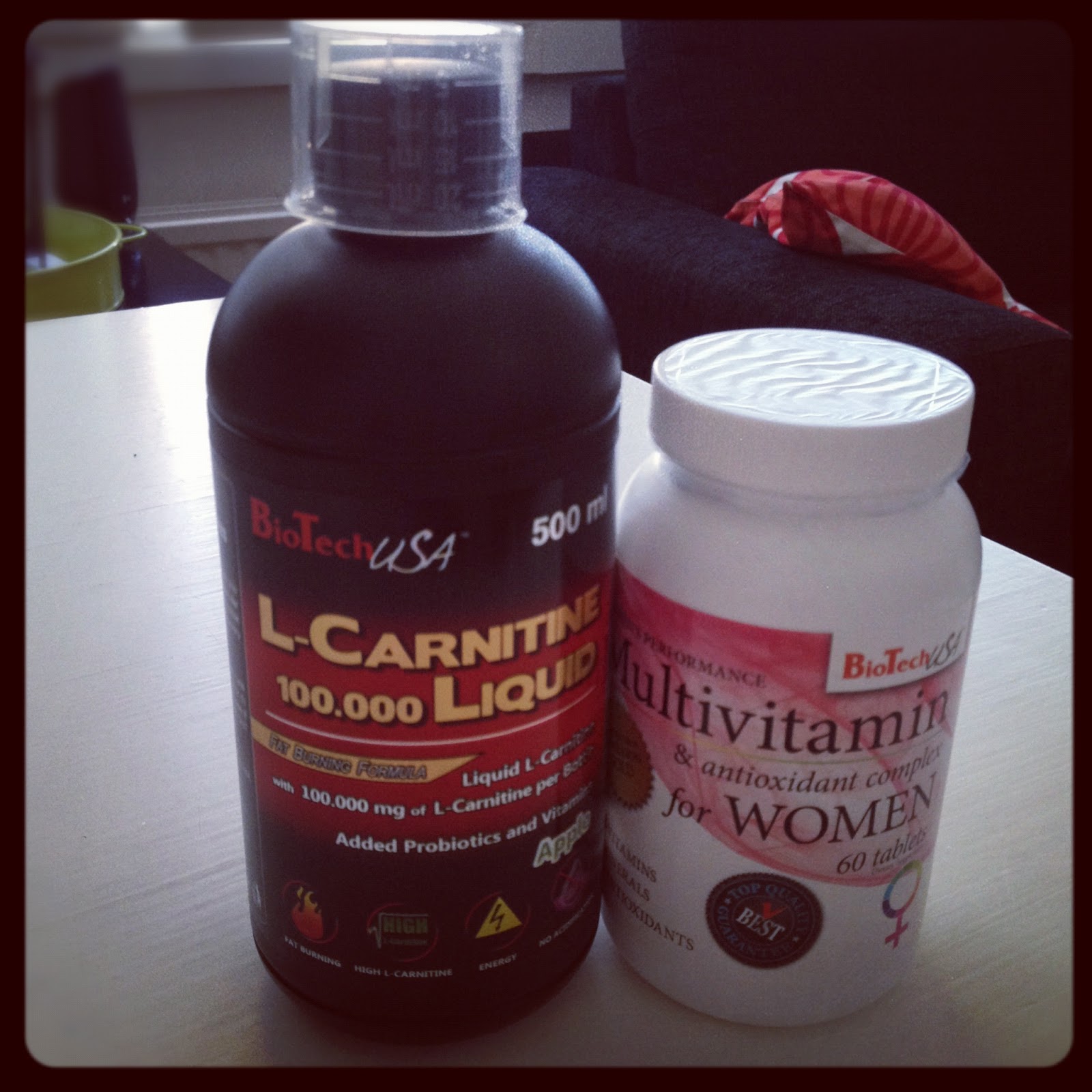 Kävin tänään myös lisäravinneliikkeessä poikaystävän kanssa tarkoituksena ostaa hänelle palaria/lisäprodee ja löydettiinkin hyvä tuote. Mukaan tarttui myös itselle vitamiinilisä joka sisältää 12 eri vitamiinia, 9 mineraalia ja 19 antioxidanttia ..Oon vähä vitamiini höperö 😉 Ostin myös pullolisen L-Karnitiinia (tutun)myyjän suosittelemana. Otan ennen treeniä 20ml nestettä joka sisältää 4000mg L-Karnia tai sitten 10ml ennen treeniä ja 10ml treenin aikana rippuen treenin laadusta.