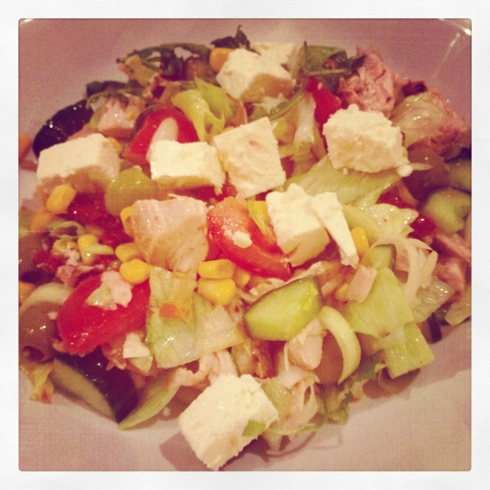 | kana-feta-oliivi-maissi-aurinkokuivattutomaatti-salaatti 🙂 |
