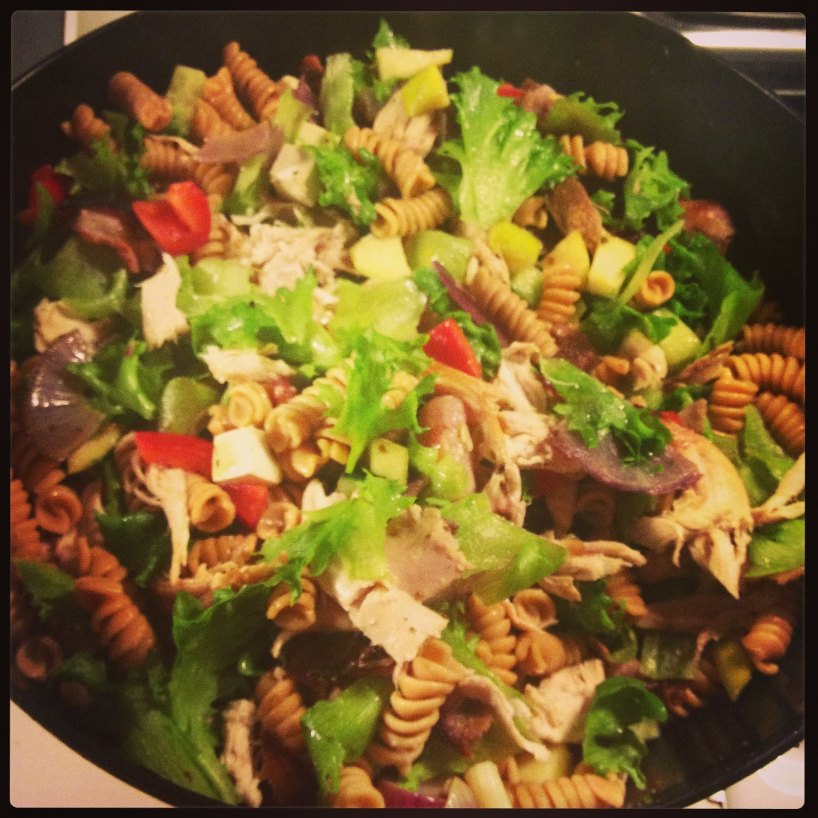 Tein äsken taas ison kulhollisen kana-pekoni-pastasalaattia ja mässäilen sitä täällä Jutan&superdieettien seurana 🙂 Oon tavannut tehdä ”kastikkeen” kermaviilistä ja mausteista, kuten tein tänäänkin. Ostin vanhingossa KEVYT kermaviiliä ja hyi hitto mitä litkua tuo on 😀 Kunnon kamaa sen olla pitää. Oon muutenkin alkanut ostaa enemmän normaaleja tuotteita kevyiden sijaan. Juustot ja maidon ostan kevyenä, tosin juustoa en enää edes käytä juurikaan.