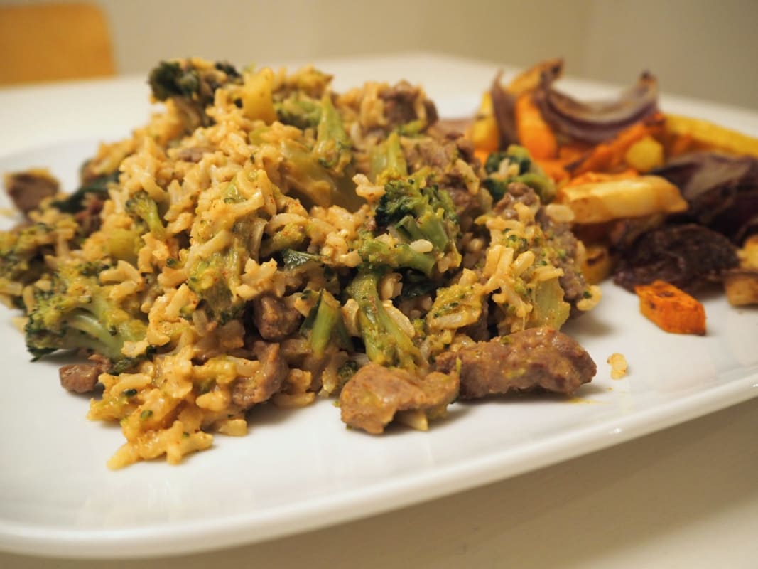 Samaisesta kookosmaidosta saa kivan kastikkeen myös riisille ja naudan paistisuikaleille. Huomaatteko, että kaikki annokset ovat jonkinlaisia sekoituksia? Mulla onkin tapana keitellä pastat tai riisit, paistella lihat tms, keittää vihannekset ja sitten sekoittaa kaikki yhteen pannuun. Päälle tomaattipureeta tai kookosmaitoa ja pata on valmis. 🙂