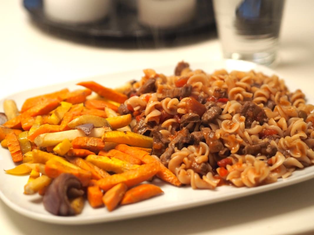Vaikka valmistan lähes kaikki ruuat itse omin kätösin, pyrin valmistamaan aika helppoja ja nopeita sapuskoja. Löysin meidän lähikaupasta noita kuvassa näkyviä juureksia valmiina pussissa pilkottuna. 🙂 Jos on kiireinen (tai laiska) eikä pilkkominen nappaa, tuollaiset helpottaa hommaa, ainakin välillä. Seoksessa taisi olla kolmea tai neljää eri juuresta sekä punasipulia. Kaadan vaan pussin sisällön uunipellille, päälle hieman oliviiöljyä ja herbamarea, sitten uuniin vartiksi ja sillä välin muut sapuskat valmiiksi. Olin unohtanut ostaa tomaattipureeta, joten käytin kastikkeena jostain tortilla-illasta ylijäänyttä salsaa. Näitäkin löytyy nykään sokerittomina, peukku sille.:) Pastana annoksissa toimii jo usasti mainittu täysjyväriisistä valmistettu fusilli.