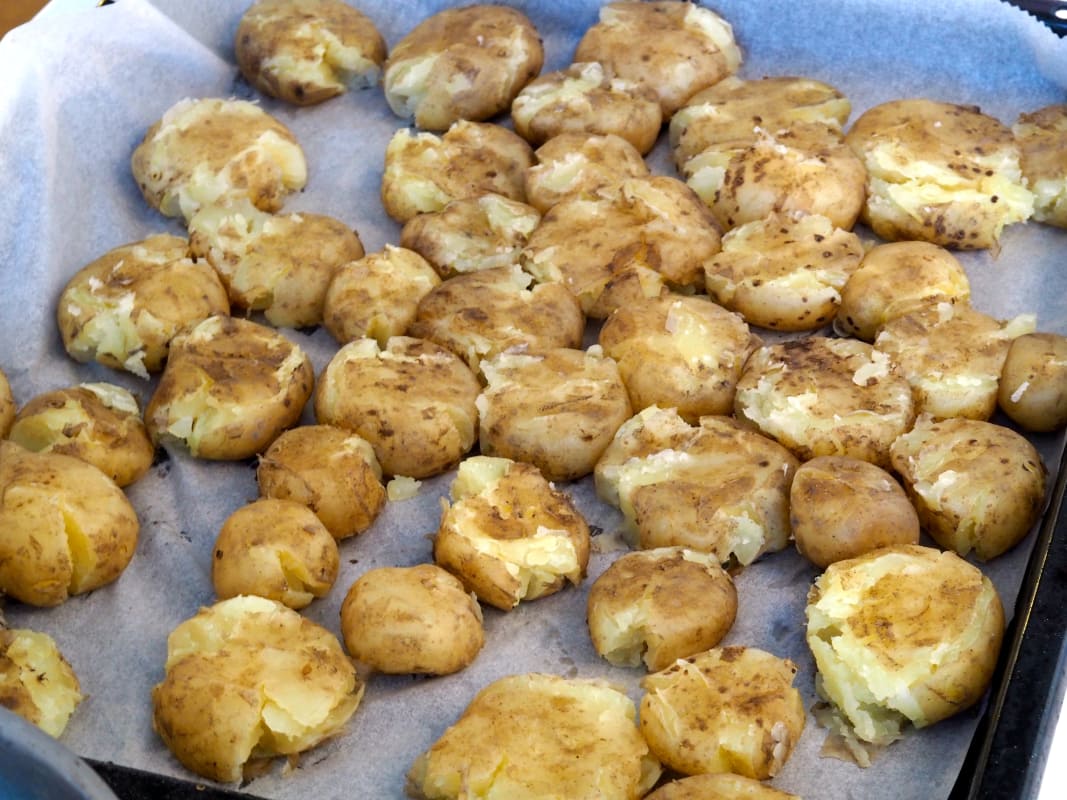 Perunat siis pestään ja keitetään lähes kypsiksi. Tämän jälkeen ne levitetään uunipellille ja ”murskataan” esimerkiksi paistolastan avulla. Perunat voidellaan valkosipulisella voiseoksella, johon tulee n. 50-100 g sulatettua kirnuvoita (voin määrä riippuu perunoiden määrästä, itsellä oli 2 litraa perunoita ja 100 g voita), johon on sekoitettu 5 pilkottua valkosipulinkynttä, yrttisuolaa, valkosipulijauhetta ja ripaus chiliä. Lopuksi perunoiden päälle ripotellaan rosmariiniä, jonka jälkeen 225 asteiseen uuniin n. 20 minuutin ajaksi. Helppoa, rapeaa ja hyvää!